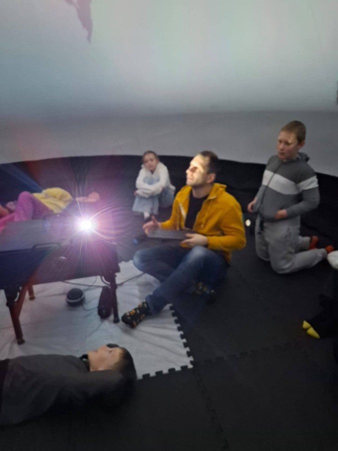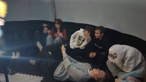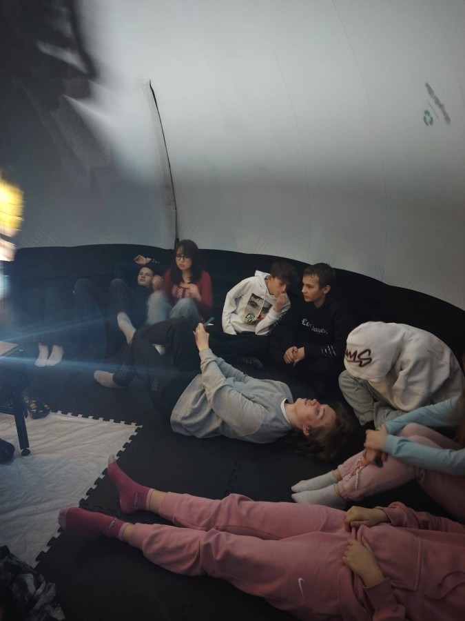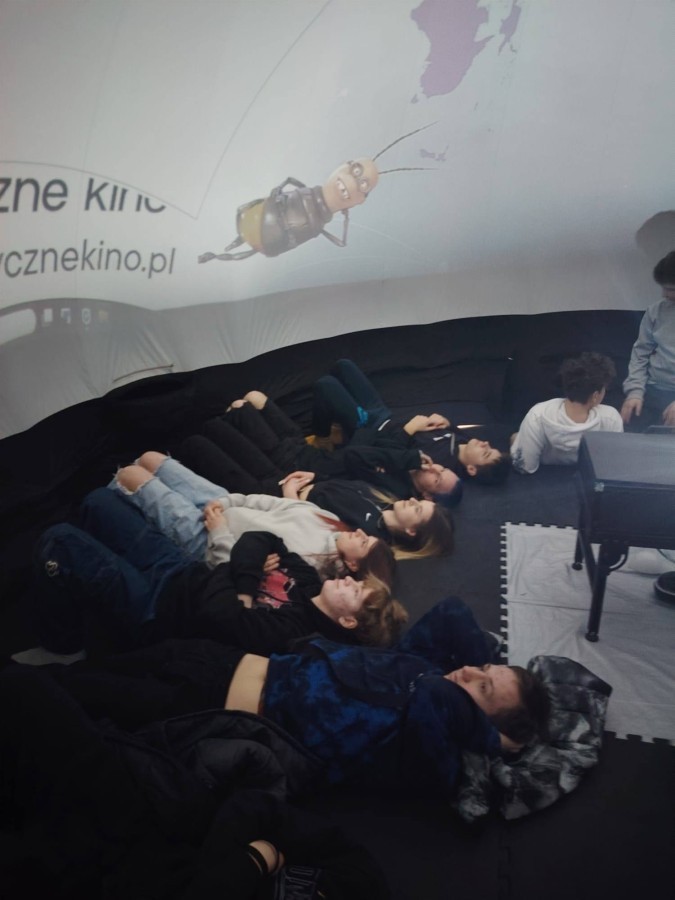 Podczas seansów uczniowie mogli obejrzeć filmy wyświetlane na kopule 360°, co dawało niesamowite wrażenie „zanurzenia” w obrazie. Leżąc wygodnie i patrząc w górę, czuliśmy się jak prawdziwi odkrywcy – raz astronauci, innym razem badacze oceanów czy podróżnicy w czasie.
