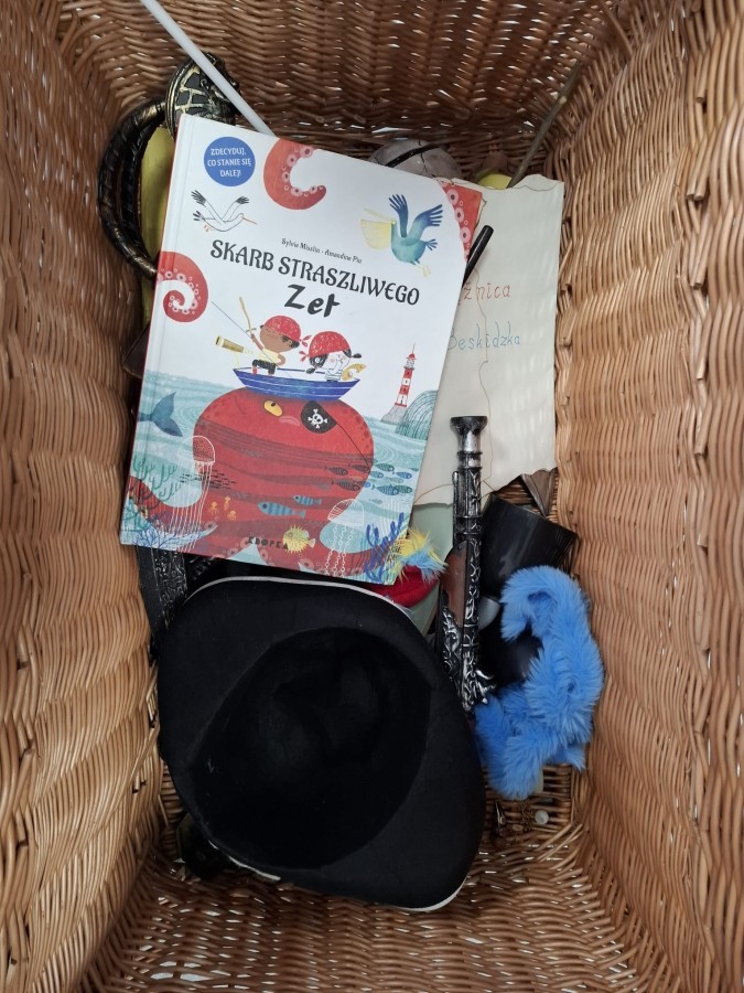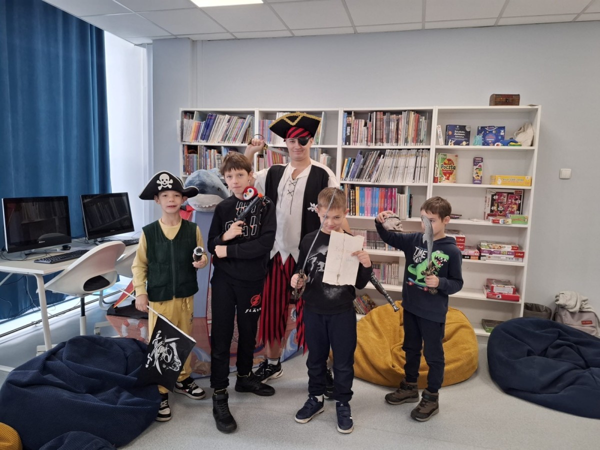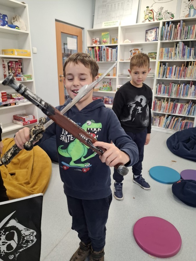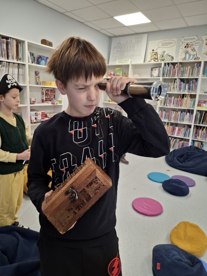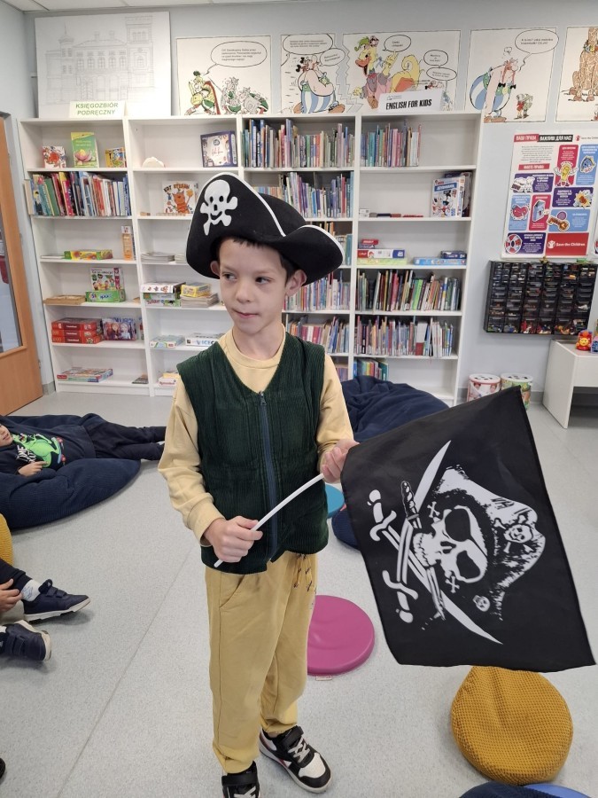 Podczas zajęć „Poszukiwanie zaginionego skarbu – piracka przygoda” mali odkrywcy wcielili się w rolę dzielnych piratów. Razem tropili zagadki, odkrywali wskazówki ukryte wśród książek i uczyli się, że największym skarbem jest… WYOBRAŹNIA!